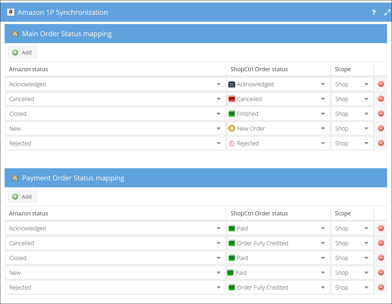 Payment Order Status mapping Amazon doesn't return payment status/payment when retrieving orders via API integration. Though for finilizing orders inside ShopCtrl you might need to configure the mapping rules. Assuming that closed order is a paid order, you can map it to ShopCtrl Paid status. Cancelled or Rejected orders can receive Fully credited status.