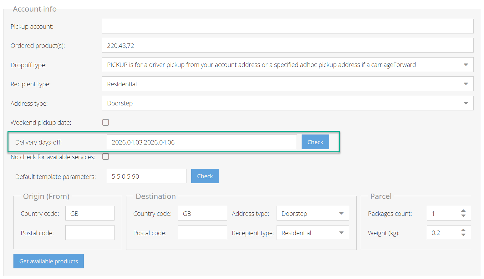 - Click Get available products to dynamically retrieve the suitable services list from DHL Parcel UK.