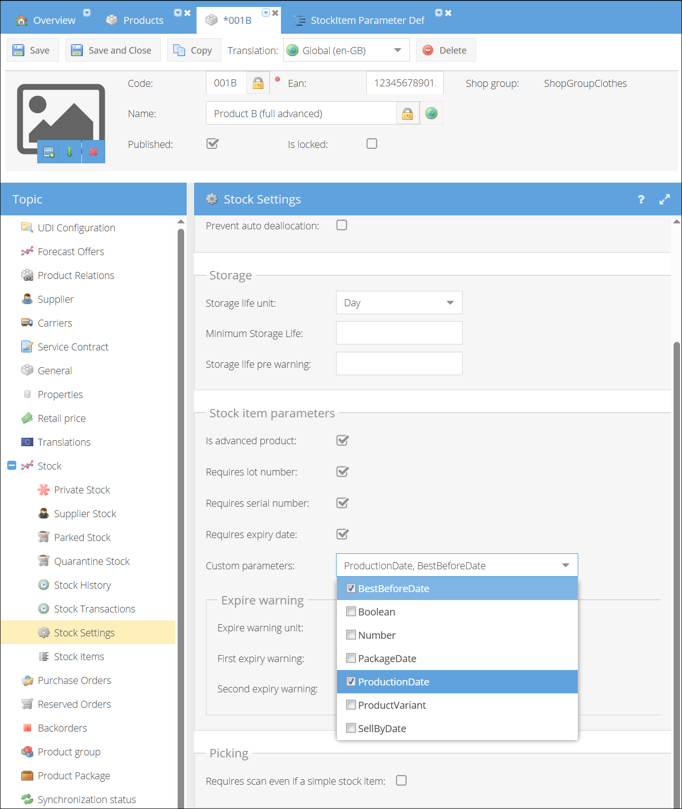 - Go to Product > Stock settings > Stock item parameters > Custom parameters.