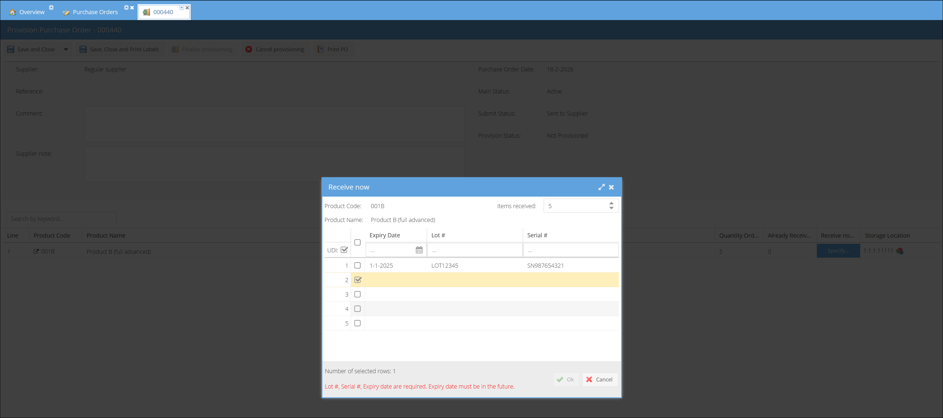 - Once all items are scanned and verified, click Save to complete the provisioning process. All UDI data is stored against the respective stock items.