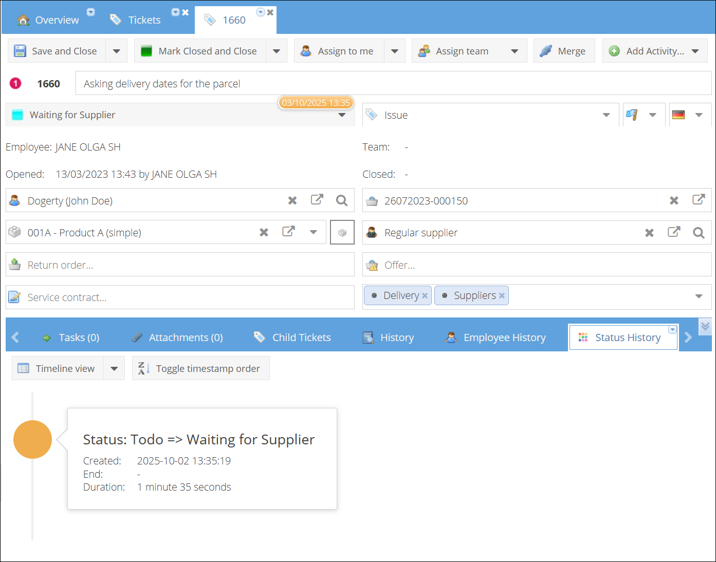 - When you link a ticket to that supplier and set its status to Waiting for Supplier (without manually choosing a time), the system will automatically calculate the target date and time based on the supplier's configured waiting time and default SLA.