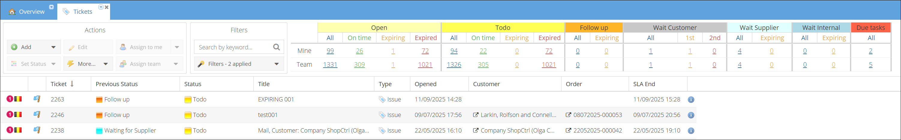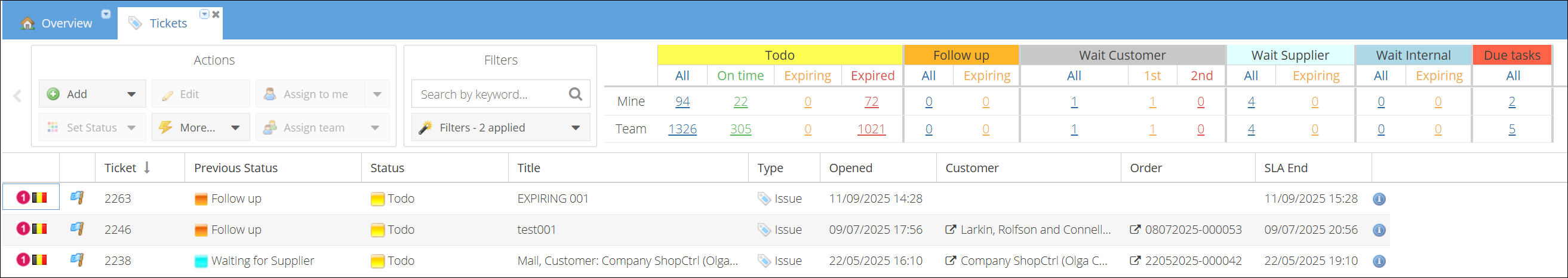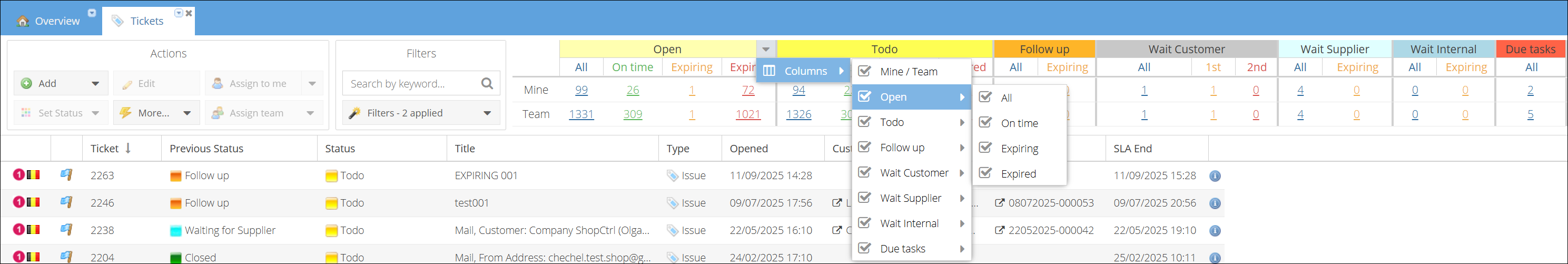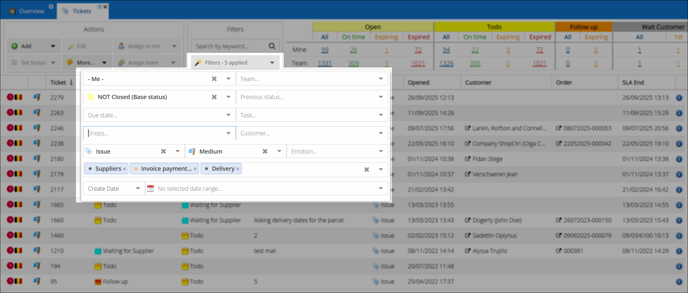 Open (Filter): This is now a top-box filter that encompasses all non-closed tickets, including Todo, Follow up, Wait for Customer, Waiting for Supplier, and Waiting for Internal Team.